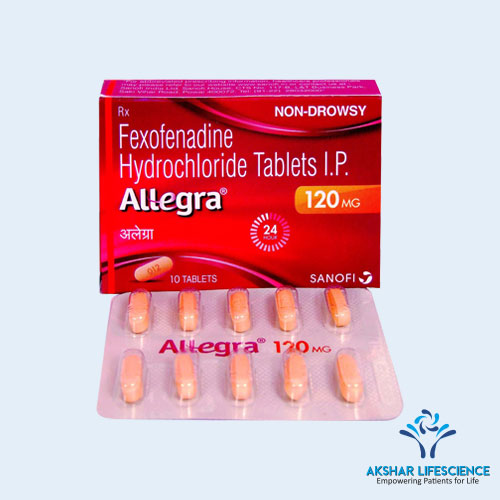 ALLEGRA 120 mg Tablet is an antihistamine medication used to relieve allergy symptoms. It is effective in treating conditions such as seasonal allergic rhinitis (hay fever) and chronic idiopathic urticaria (hives). Fexofenadine works by blocking the action of histamine, a substance in the body that causes allergic symptoms like sneezing, itching, runny nose, and watery eyes.