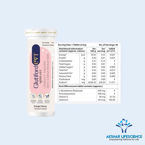 Glutiford EVT is an effervescent dietary supplement designed to support overall health and wellness. It combines powerful antioxidants and nutrients that promote skin health, enhance immune function, and support liver detoxification. The effervescent formulation allows for quick absorption and a refreshing taste.