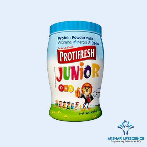 Description: Protifresh Junior is a specialized protein powder designed for children, aimed at supporting growth, immunity, and cognitive development. The inclusion of DHA is particularly beneficial for brain health, while the protein and vitamins contribute to overall nutritional needs.