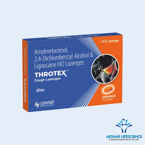 Throtex Cough Lozenges are formulated to provide relief from cough and throat irritation. The combination of Amylmetacresol and 2,4-Dichlorobenzyl Alcohol acts as antiseptics, while Lignocaine serves as a local anesthetic to soothe throat discomfort. These lozenges are effective in alleviating symptoms associated with dry cough and throat infections.